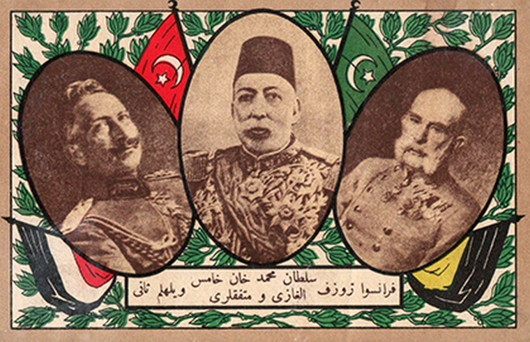 | Postcard depicting Sultan Mehmed V, Emperor Wilhelm II of Germany, and Emperor Franz Joseph of Austria-Hungary. Source: Art-A-Tsolum |